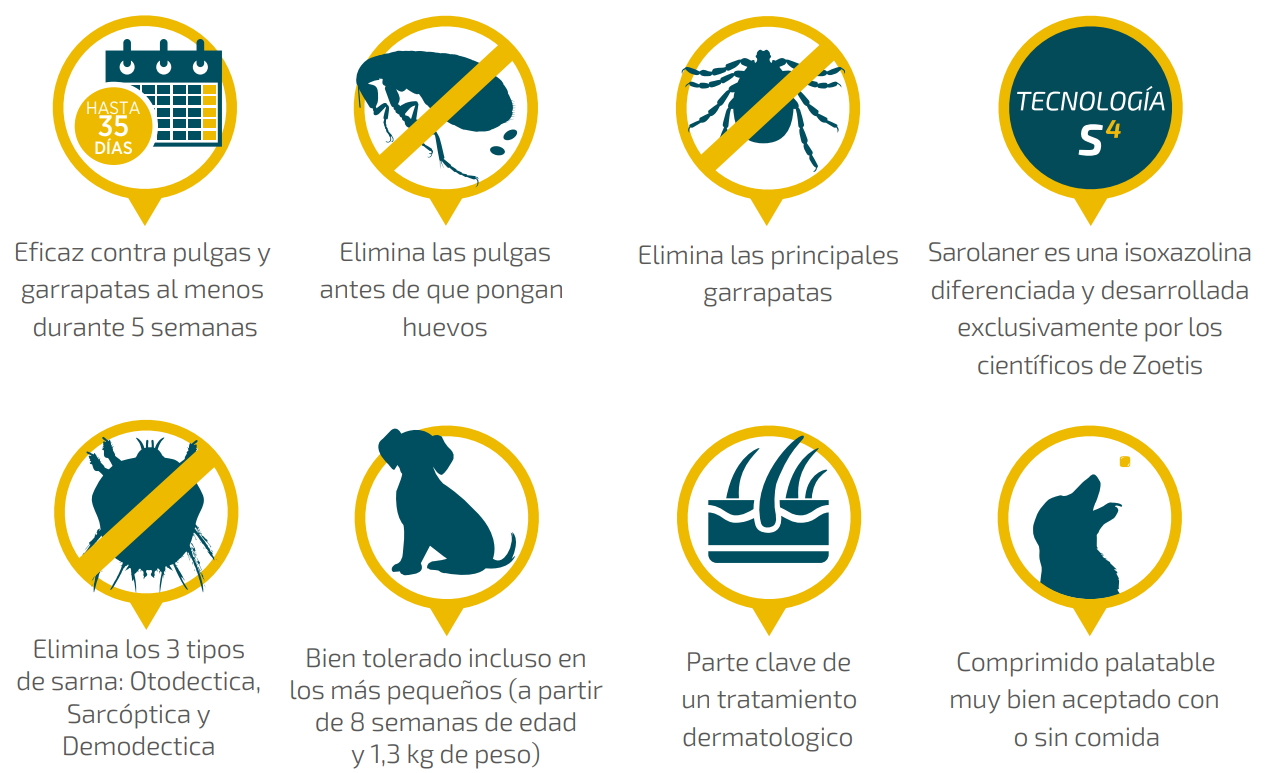 Su principio activo es Sarolaner, una isoxazolina diferenciada y desarrollada exclusivamente por los científicos de Zoetis. Más de 3.000 moléculas fueron estudiadas e través de investigaciones para evaluar el espectro de acción, potencia, farmacocinética y seguridad; dando como resultado a Sarolaner: una solución eficaz, potente, segura, completa y con acción sostenida y prolongada.2